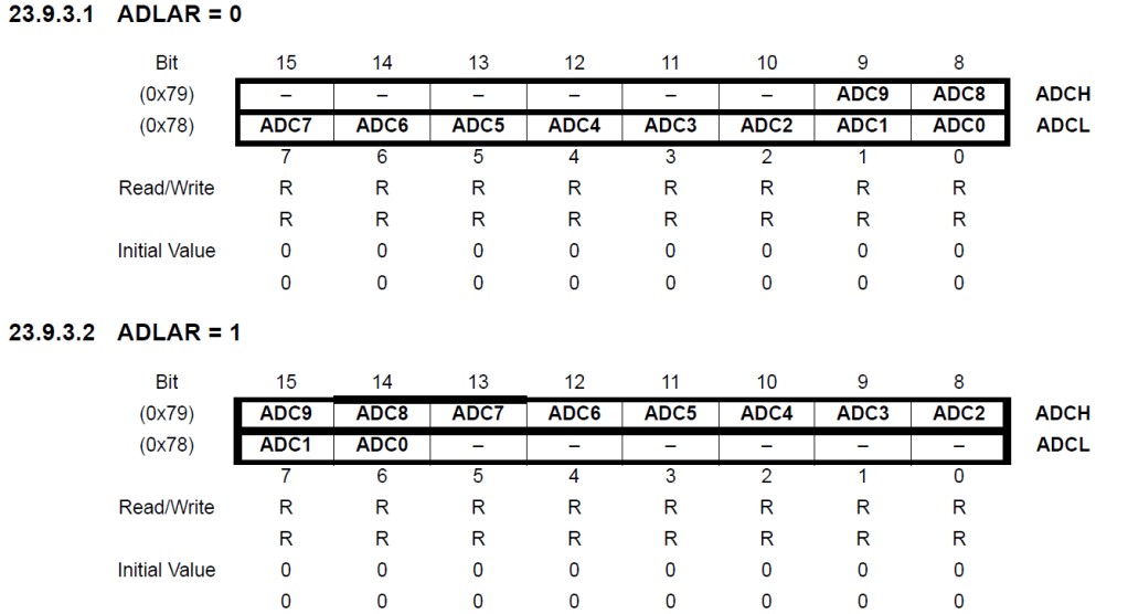 ADLAR : Bu bit değeri elde ettiğimiz 10 bitlik sonucu ADCH ve ADCL data registerlarına yazma türünü belirler. Eğer ADLAR biti set edilirse 10 bitlik adc değeri 16 bitlik hafızada sola dayalı olarak yerleştirilir, RESET konumunda iken de sağa dayalı olacaktır. Aşağıdaki görsel daha anlaşılır hale getirecektir.