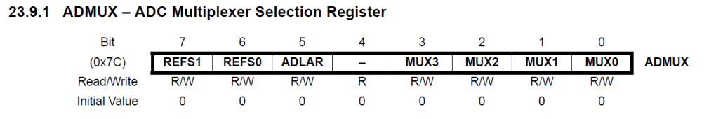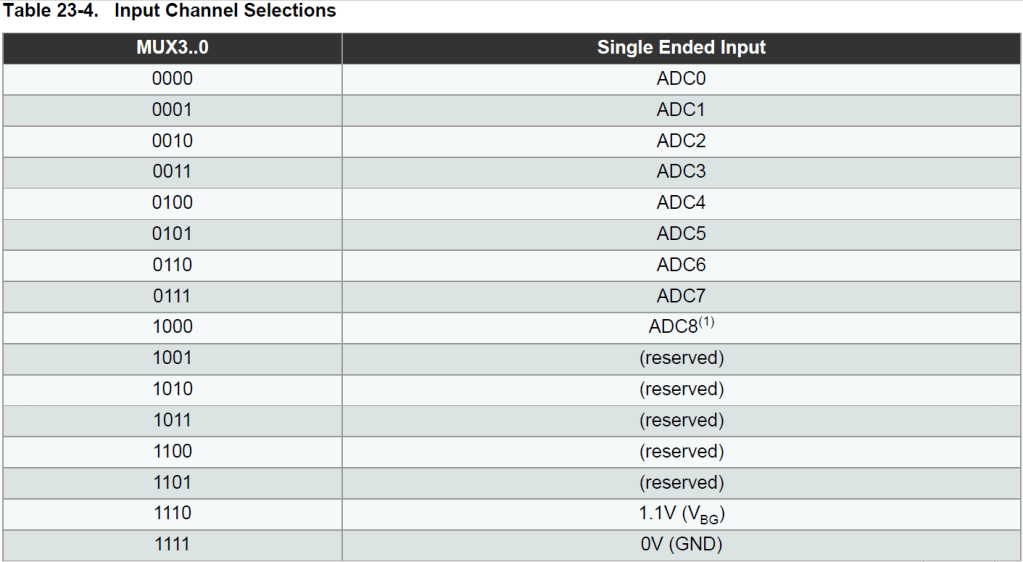 MUX3:0 : Bu bitler adc giriş kanalını seçmemizi sağlar. Değerler aşağıdaki tablodaki gibidir.