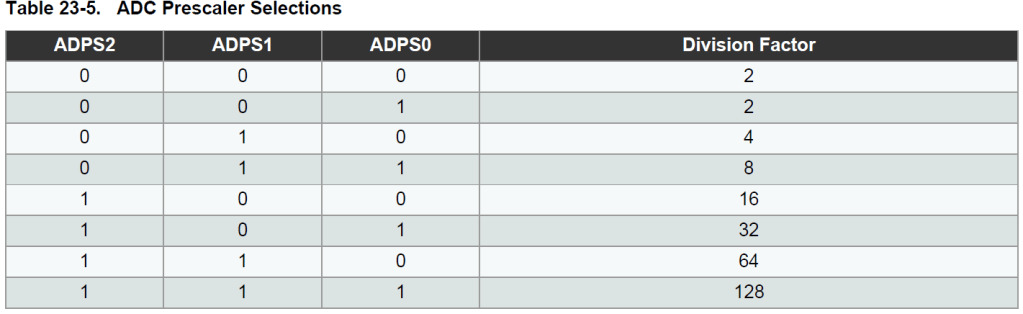 ADPS2:0 : Bu bitler, sistem saat frekansı ile ADC saat frekansı arasındaki bölme faktörünü belirler. Değerler aşağıdaki tablodadır. ADC birimini istediğimiz saat frekansında çalıştırabiliriz.