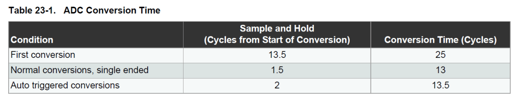 Normal çevrimde, 13 ADC clock cycle’ı kadar geçen çevrim zamanına ek olarak 1.5 ADC clock cycle’ı da örnekleme ve tutma zamanı için harcanır. Bir ADC çevrimi toplam olarak 13.5 ADC clock cycle’ı kadar sürer.